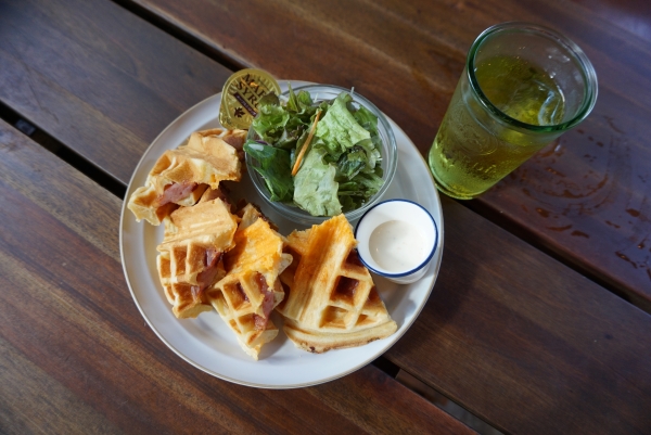The homemade waffles cost 1,000 yen each and come in three flavours: ham and cheese with salad,