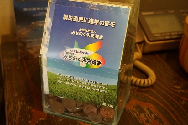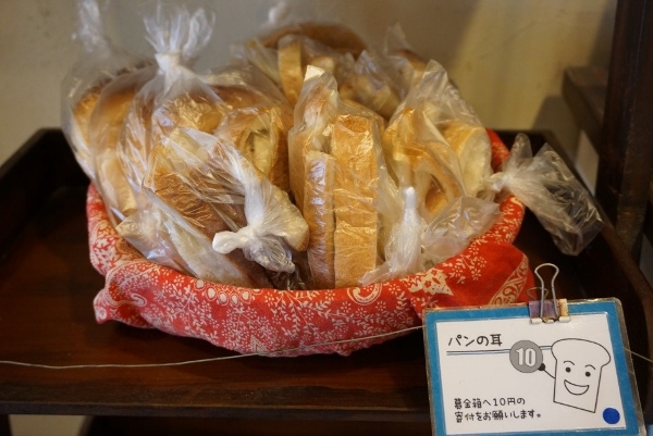 And once inside the shop, the kids also like to buy the crusts from the loaves used to make the sandwiches. For 10 yen they can buy a small bag of crusts, with the money going into a donation box in aid of school children who lost one or both parents in the wake of the 2011 East Japan Earthquake. To date, participating customers, principally children, have donated over 60,000 yen to this charity.