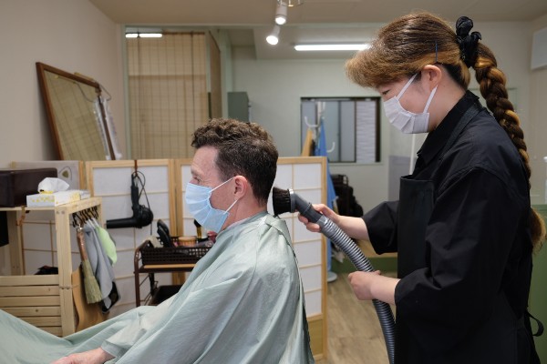 After an enjoyable demonstration of her scissor technique, Ms. Inukai neatly tidies up the stray hair. “I don’t do perms,” she explains, “and the only colouring I offer is dyeing grey hair. Apart from that, anything is fine, although some more complex cuts may require a little extra fee as they take longer. I also have a shampoo and drying service for people who cannot use a shower or bath, for whatever reason.”