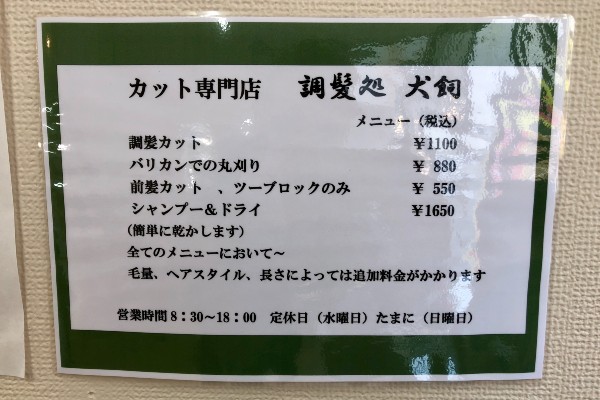 While Chohatsudokoro Inukai is definitely a hair salon and Ms. Inukai is vastly experienced, the prices are very reasonable indeed. A regular cut (chohatsu) is just 1,100 yen, a buzz cut with clippers is 880 yen and a fringe cut is just 550 yen. “Many younger schoolkids come in for a fringe cut because they don’t want their mums doing it,” she says, laughing.