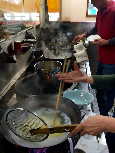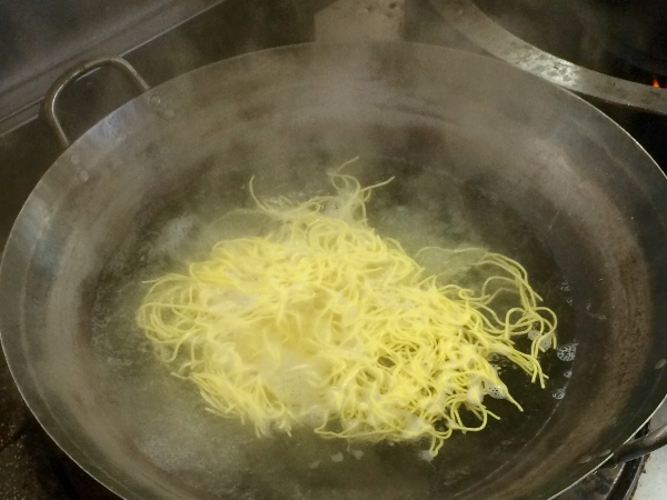 The Naganos repair to the kitchen to prepare a bowl of Tanmen and a furious, intense burst of activity ensues. First, the egg noodles are boiled.
