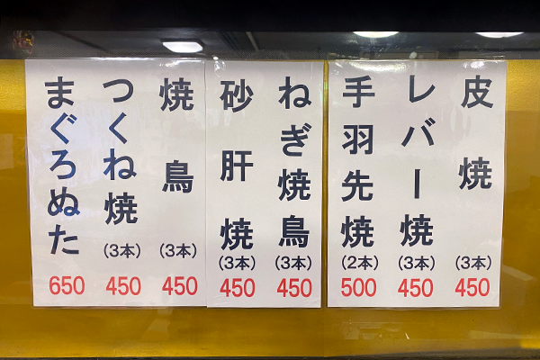 Most yakitori are priced at 450 yen for three skewers.