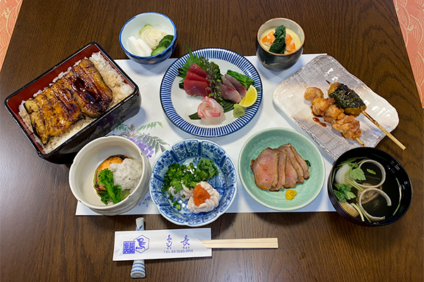 A sumptuous course using carefully selected ingredients, including their famous yakitori (grilled chicken), unaju (eel over rice), 3 appetizers, sashimi, steamed egg custard, etc., is available for 7,600 yen.