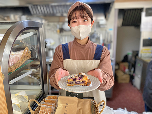 Pâtissière Ms. Suzuki honed her baking skills for five years before joining Sunamachi Coffee at its inception, creating the baked goods menu herself, mostly to original recipes. “The cakes and baked goods I make are not overly sweet. My aim is to create confectionery that customers enjoy but want to eat more of immediately.” Here Ms. Suzuki models a slice of blueberry and lemon tart, the most popular on the menu (380 yen).