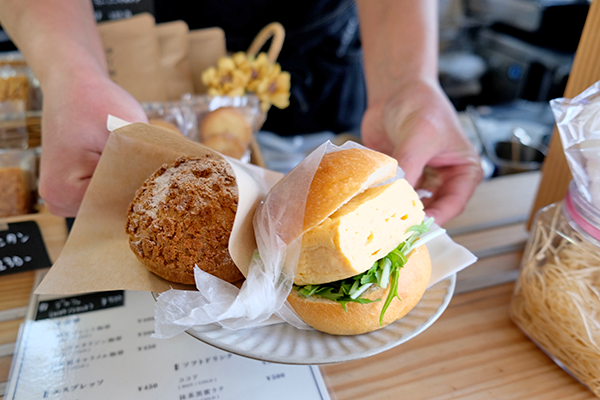 Mr. Fukuchi learned the business working in a cafe bakery for ten years. He bakes the bread at Sunamachi Coffee and also makes the egg roll used in the tamagoyaki egg sandwich (450 yen), which is topped with a touch of mustard mayonnaise, also homemade. Paired with a choux crème and a cup of coffee, it makes a real treat of a lunch.