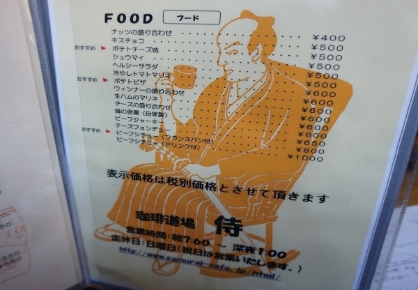 And if you are considering settling in for an evening at Coffee Dojo Samurai, as part of the alcoholic drinks menu there is an extensive cocktail section, including five original coffee-based cocktails, all priced at 600 yen each.