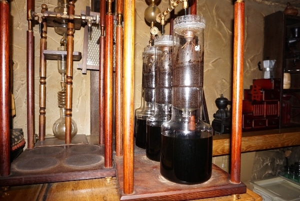Coffee Dojo Samurai’s signature coffee is the “mizu-dashi coffee” (cold-brewed or water-brewed coffee). Using a fascinating antique-looking contraption of glass bubbles, tubes, and receptacles, like something out of a science experiment, water is drip fed through a blend of Honduras and Colombia ground coffee beans over an 8-hour period. The liquid is then placed in a fridge for 24 hours before being served up as iced coffee or heated before being served hot.
