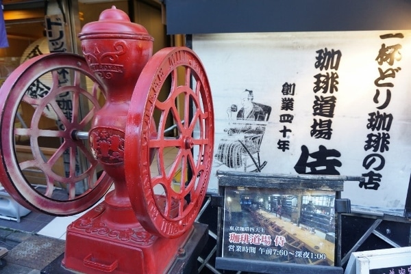 Coffee Dojo Samurai occupies the 2nd floor of a building directly opposite the East Exit of Kameido Station. Outside the entrance to the building you can’t miss its large red coffee grinder and picture of a samurai relaxing in a rocking chair and sipping a cup of coffee.