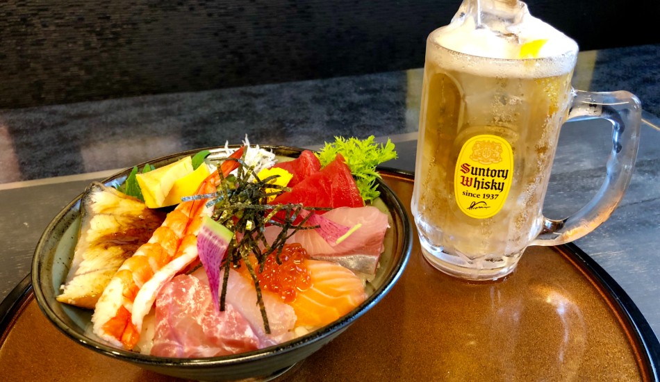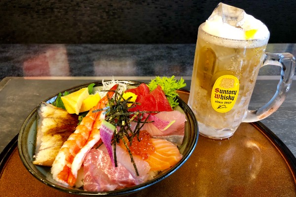 The evening Happy Hour from 6~8pm features a deluxe version of the seafood bowl with one drink for 2,000 yen including tax. Again, it’s very popular with the early evening crowd; having sampled the seafood bowl we can attest to its quality and taste. On the day we visited it contained Pacific bluefin tuna, conger eel, tuna, sea bream, minced tuna and negi onion, shrimp, whitebait, salmon, shrimp and egg. Wow!