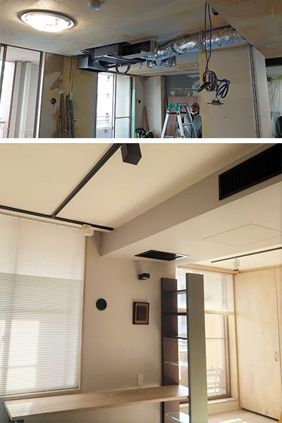 The Tokyo climate makes great demands on designers, as sweltering, humid summers give way to cold, bone dry winters. Seasonally suitable air conditioning, ventilation, and heating are vital to create a living environment that allows people to work or study in optimum conditions. Here the craftspeople install a built-in air conditioning system.