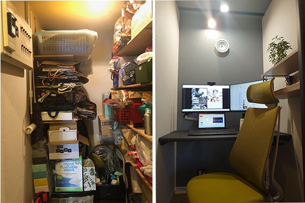 One key area they targeted for renovation is dead space. It’s neither excessively expensive nor time consuming to turn a walk-in closet into a smart and comfortable workspace. This room features soundproofing and ceiling track lights, with enough desk width for a double monitor setup. LAN cables can be installed through the walls or ceiling, and there’s even room for shelving to add some colour to your background for online meetings.