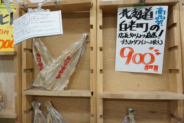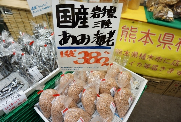 Fish products also receive the “sanchoku” treatment. There were bags of dried ami-ebi from Iwate Prefecture. These are tasty just on their own as nibbles with drinks, or make an enjoyable meal mixed with pasta or fried rice. Alongside them were bags of dried sardines, which are great for chewing.