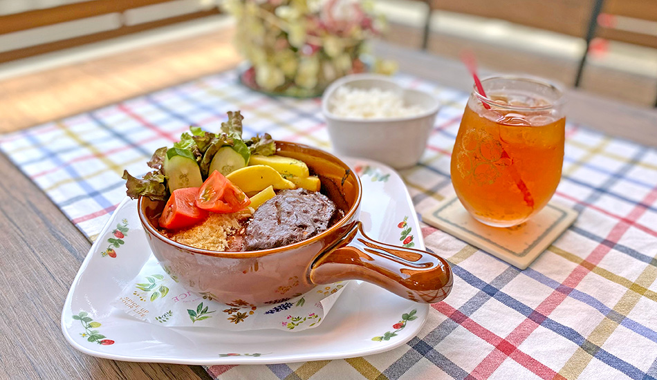 The menu at Apricot features a variety of popular dishes, all handmade as far as possible. “I’m fussy about all the ingredients,” said Ms.Higuchi. The number one bestseller is this hamburg and gratin set at 1,100 yen, featuring a meaty hamburg steak in homemade demi glace sauce, creamy cheese, and meat gratin, fried potatoes, salad and rice. It’s a hearty meal available all day. Customers can also order side dishes at a small extra cost: miso soup is 50 yen, salad is 110 yen, a larger portion is 220 yen, coffee or tea of the day is 220 yen and royal milk tea is 330 yen. That all represents very nice value!