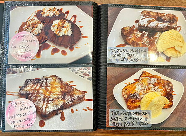 If you still have room for a dessert you’re in luck as Apricot offers some very tasty looking puddings. Our eyes were immediately drawn to the brioche French toast, drizzled with caramel syrup. Slices are 770 yen each; if you order a Mita San special of three slices you get free vanilla ice cream too, all for 1,540 yen. (Mita San is a regular customer who loves French toast). Homemade shiratama rice dumplings are also a popular item.