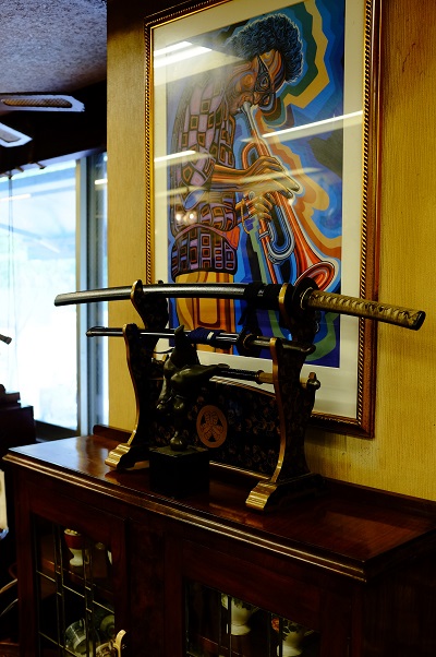 In Japanese, the word fun’iki means “atmosphere” or “ambience.” After coffee beans, fun’iki is the next biggest draw of  Edo Fukagawa Coffee Hompo. The tables and chairs are antique, and made of wood, of course. They have a seen a lot of coffee drinking in their days. There are antiques everywhere: precious plates and containers in cases in the back, Art Deco style statutes of nymphs, prints of jazzmen on the walls, and swords everywhere. Yes, swords. Mr. Yamaoka is a practitioner of the Japanese sword arts. If you ask him, he will patiently explain the similarities between Japanese budo, (the way of the warrior) swords and coffee making. The short explanation is that his budo influences his coffee making because both swords and coffee are hand-made by humans and have heart.