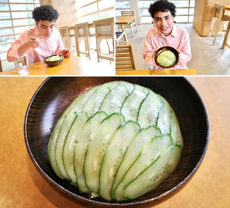 The specialty at Ginza Sicilia Toyosu Branch. A fresh lettuce salad made with vegetables procured from the market of Toyosu, thinly sliced and covered with cucumber.