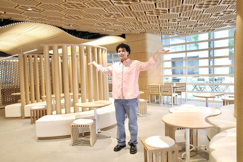 The Interior design is modern and adapts to the university it is located in! The store predominantly uses circles and wavy formations throughout the shop. He utilizes his signature style of incorporating recycled paper tubes throughout the restaurant. My favorite aspect of it is the honeycomb-designed ceilings.