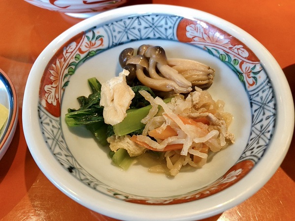 The Obanzai selection consists of around ten different items which change with the seasons. Ordered individually they cost 300 yen each but a mixed plate like this costs 800 yen for one person, which is very reasonable. For two people though, it’s 1,000 yen or for three just 1200 yen, or 400 yen each. Vegetables such as eggplant, carrot, burdock root, Japanese mustard greens, bamboo shoots, daikon radish, shiitake mushrooms, taro, and the like are gently simmered in light sauces to bring out their natural flavour. There are also such items as macaroni salad and the traditional sweet egg roll. The obanzai menu is the most popular in the evening, Ms. Hoshiba pointed out.
