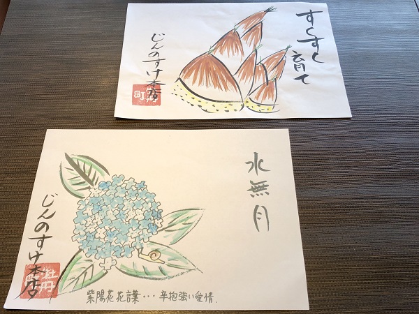 Among her many talents Ms. Hoshiba also has artistic tendencies. She somehow finds time to design and draws these beautiful place mats, which change with the seasons.