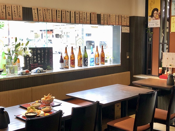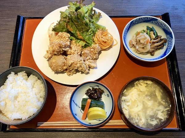 While the obanzai selection, which sits very nicely with Japanese sake, is the most ordered in the evening, the clear winners in the daytime are the lunch sets, and the most popular lunch set is the deep-fried chicken (karaage teishoku). Big juicy chunks of crispy fried chicken, potato salad, a little pasta, pickles, a small obanzai-style vegetable plate, egg soup and a huge bowl of rice all for the princely sum of 850 yen. It was delicious, and like the obanzai selection represents remarkable value.