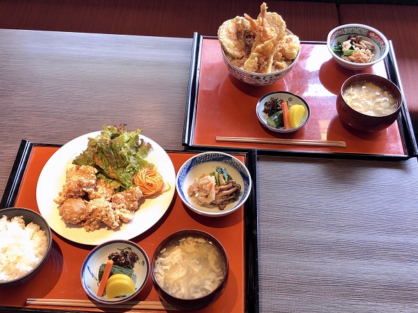 Together with the tempura and fried chicken sets, the lunch menu features pork loin cutlet (tonkatsu), pork and ginger, and a chilled tanuki udon noodle served with a bowl of rice topped with whitebait. The latter is a real summer dish, perfect for the humid heat of July and August. All lunch sets are 850 yen. There’s a daily takeout lunch available for 800 yen, which on this particular day was tempura on rice.