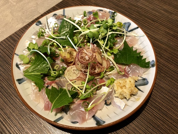 The main menu at Jinnosuke features something like 50 different dishes. Soba, udon, ramen, and donburi are all represented, together with a wide variety of tasty treats, from beef tendon stewed with daikon radish, crab croquettes and smoked duck. This horse mackerel sashimi is just 680 yen.