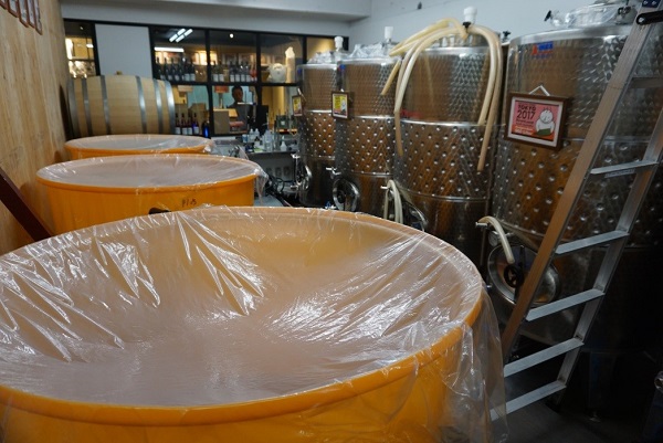 Grapes are brought from Aomori, Nagano, Yamagata and Yamanashi to the winery here in Tokyo to be pulped and squeezed, and the juice left to ferment before being filtered and bottled. This all takes place inside incredibly cramped but spotlessly clean premises. The white wine is fermented in temperature–controlled stainless steel tanks, whilst the red wine, which can be allowed to ferment at higher temperatures, is usually left in vast yellow vats. These can all be viewed through large windows in the bar counter area.