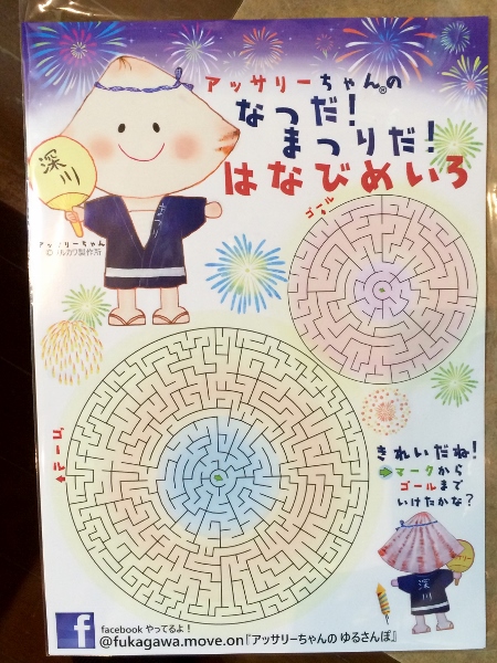 “I was eating dinner with my family some ten years ago and happened to mention that there wasn’t a character or any associated goods purely for the Fukagawa area. My daughter said ‘Speaking of Fukagawa, the signature dish is Fukagawa-meshi (clams cooked in miso on rice).’” Fishermen in the Fukagawa area have caught short-necked clams, called asari in Japanese, since the Edo Period. “I picked up my pen,” said Mr. Furukawa,” and quickly sketched out Asari-chan”.