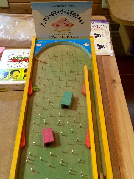 “Children can enjoy assembling the bagatelle themselves and then play with it. Hopefully it can give them a sense of achievement.” The smiling face on the bagatelle headboard is Asari-chan, an original character created by Mr. Furukawa.