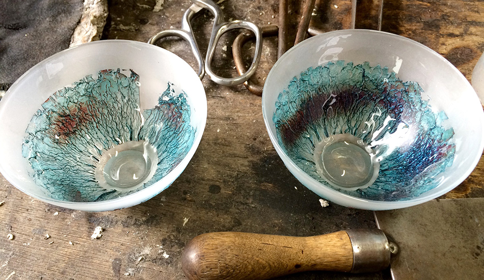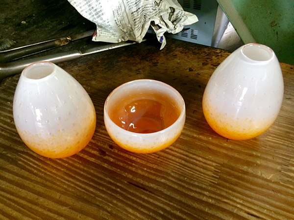 “I worked for a civil engineering company for four and a half years, designing bridges. One of my seniors suggested I try glassblowing to deepen my understanding of materials and I was hooked. I eventually quit the company and went back to school.” His partner has a similar tale. “I quit my first job to go backpacking around the world,” says Mr. Tsunooka. “When I was in Okinawa I visited a glassblowing workshop and was completely taken by it.”