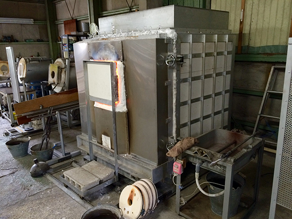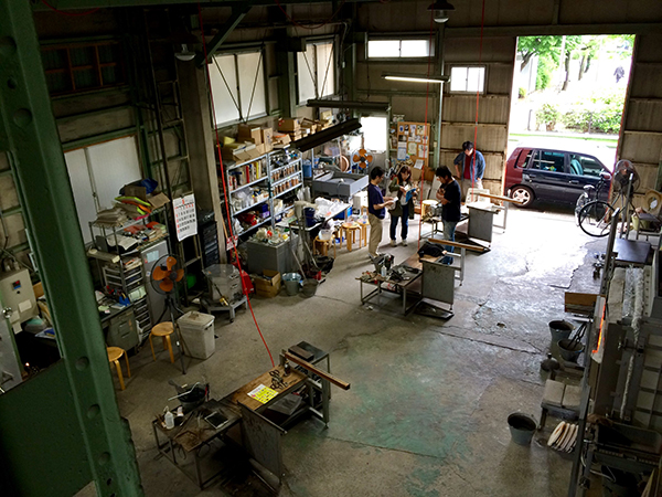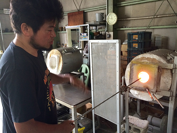 The centrepiece of the workshop is this massive furnace. “At night we put the glass batch inside a pot that goes into the furnace. The temperature reaches over 1300C, melting the glass and preparing it for the morning. The furnace stays on all the time, 24 hours a day every day, except for three times a year when we switch it off for cleaning. As you can imagine, our electricity bill is enormous, around 250,000 yen a month! We built the furnace ourselves, with another helper, a furnace specialist, to save on costs.”