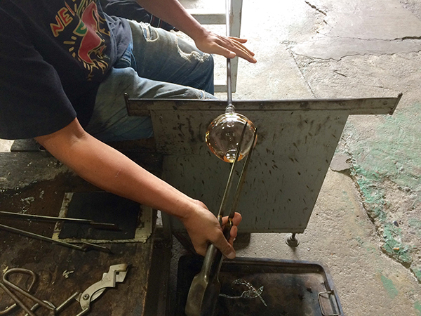 The molten glass sticks to the blowing tube and hardens as it cools. The makers rotate the tubes and use a variety of tools to create the individual, shaped pieces. It’s hot, fast work and the skill of the two men is highly impressive as they work with intense focus.