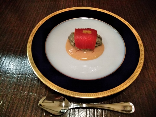 “I wanted to do liver pâté with rice wafers instead of baguettes in order to stick to a genuine, Japanese theme,” Mr. Ishii told me afterwards. “But the two alone wasn’t quite right. After a lot of trial-and-error, homemade cream cheese was added.”