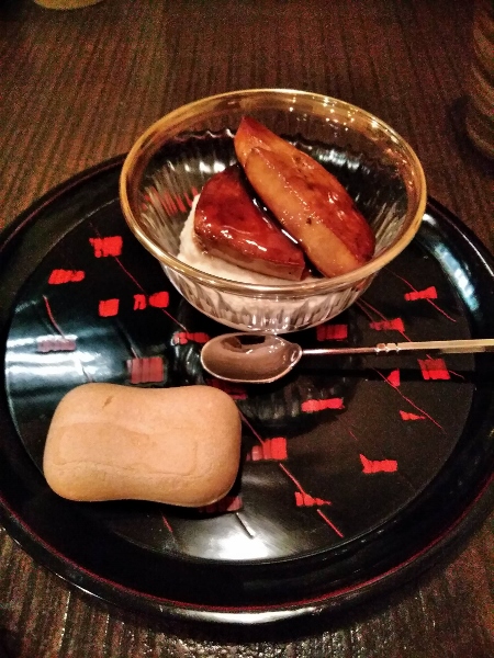 As I was just finishing appreciating this new culinary discovery, the next set of dishes came in: cream cheese and liver pâté in a monaka (rice wafer) sandwich, and fois gras over potato salad.
