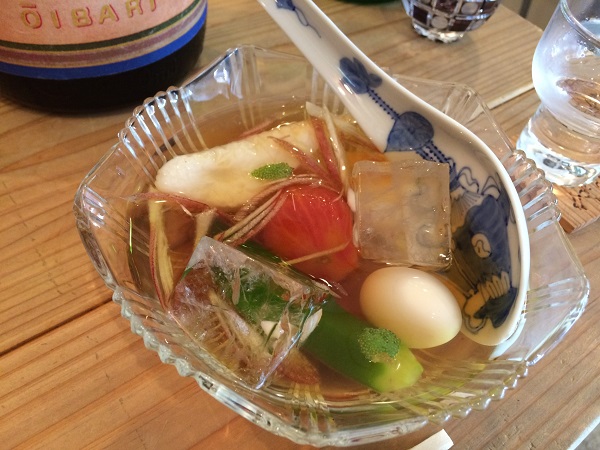 Mr. Kirekawa’s original summer oden features tomato, okra, cucumber, chicken tenderloin and myoga (Japanese ginger) all in a chilled bonito-based broth. Bonito is used in the summer, flying fish (called ago in Nagasaki) in the winter. The soup is refreshing and invigorating, very welcome on a hot and humid Koto-ku summer afternoon.