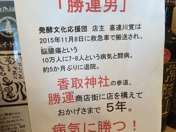 The food is delicious, the drinks superb and the host most welcoming. Everyone should pay a visit to Hakko Bunka Oendan and Katori Shrine in Kameido. Perhaps they can become a “winning luck man” (and woman) too!