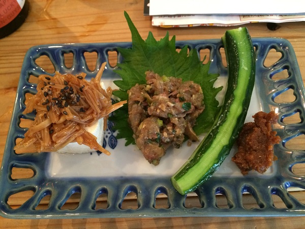 As previously mentioned, Hakko Bunka Oendan specializes in sake. Mr. Kirekawa is as passionate about Japan’s national drink as he is welcoming and we soon began a brief tour of the country, in alcohol form. A plate of tempting summer treats appeared featuring, from right to left, enoki mushrooms with tofu, namero (Chiba-style chopped and minced raw fish with miso, negi onion and other seasonings) and miso with cucumber. Yum yum.