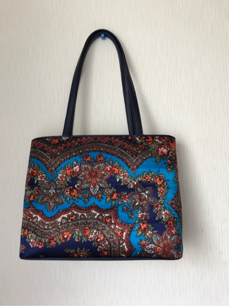 This is an example of a customer’s order. It’s a handbag made with a silk scarf and blue leather.