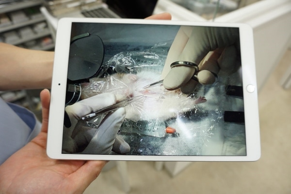 Doctor Kitamura takes pride in his operating skills on small animals, which involves great care and precision and strong magnifying spectacles, and he documents his techniques on iPad, such as a recent successful operation conducted on a hamster (see below).