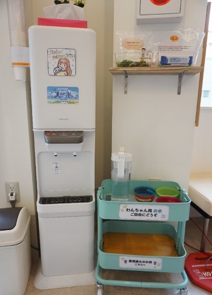 Kiba Kitamura Animal Hospital’s light and clean waiting area caters for both pets and their owners, providing drinking water (and tea in the case of owners) and dishes (or cups in the case of pets).