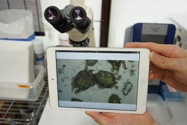 And when linked to one of the clinic’s high-powered microscopes the iPad also comes in handy for showing blood test or skin test results to a pet’s owner (the photograph below clearly shows the presence of ticks).