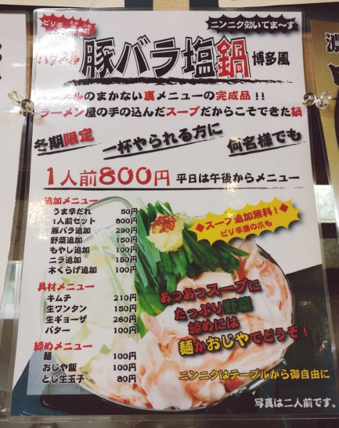 At Hustle-Ramen Honma Kameido, you can find many different kinds of ramen noodles, tsukemen (dipped ramen), and nabe (hot pot), to name a few. The nabe in particular sets this restaurant apart. It’s very rare to find that kind of dish in a ramen noodle restaurant!