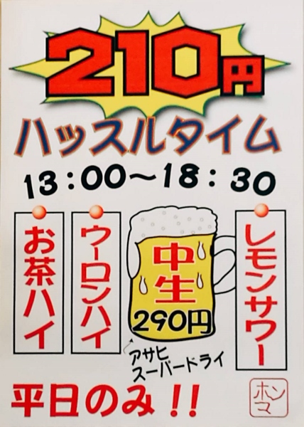 The restaurant also has “Hustle Time” in the afternoon. From 1 p.m. to 6:30 p.m. you may drink any alcoholic beverage from the specified menu for only 210 yen!