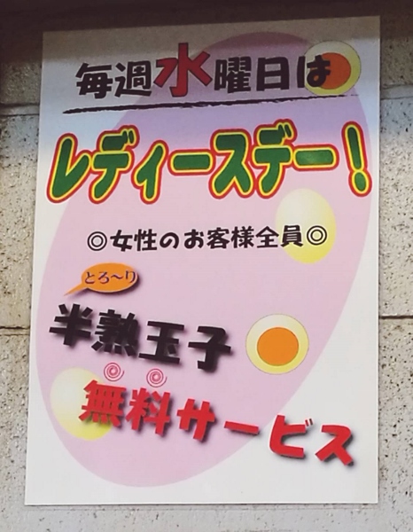 Every Wednesday, it’s “Ladies’ Day” at Hustle-Ramen Honma Kameido, and extra soft-boiled eggs are free for women! “I decided to introduce this offer in order to encourage women to come into the restaurant. Sometimes, women are a little shy about entering a ramen noodle restaurant because there are a lot of men. With this offer, I hope to encourage them to come to eat at my restaurant,” said Mr. Honma.