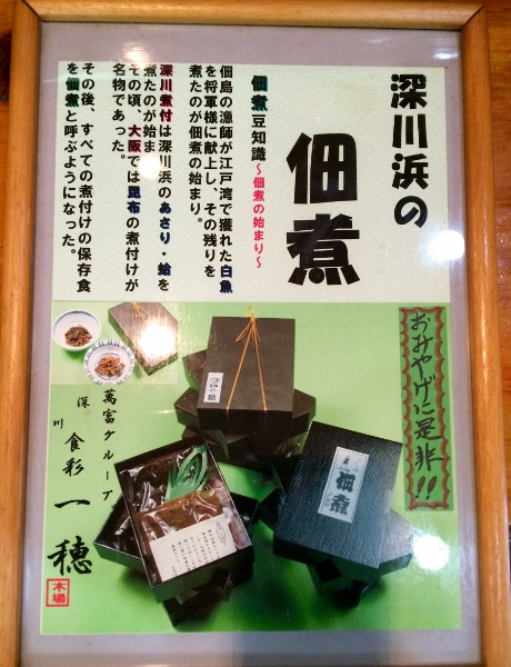 Clams play a great part in the traditional food culture of the area. Issui is famous for its Fukagawa-meshi, a dish of rice topped with clams and long onions cooked in miso. These are clam tsukudani, a preserved food made by cooking fish and vegetables in soy sauce, sake, sweet rice wine and a variety of ingredients. Tsukudani have been made in the Fukagawa area for hundreds of years and are still popular today.