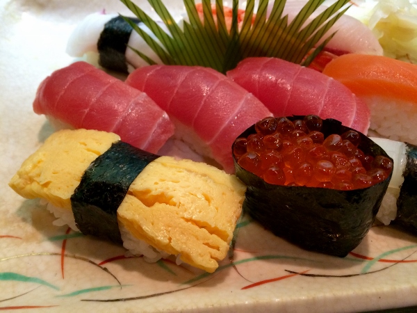 Mr. Oyama’s six-year-old granddaughter is in the restaurant as it’s the spring holiday. He takes some fish from the refrigerator and creates a plate of sushi for her in the blink of an eye. Doesn’t that look great! She sits quietly and tucks in.