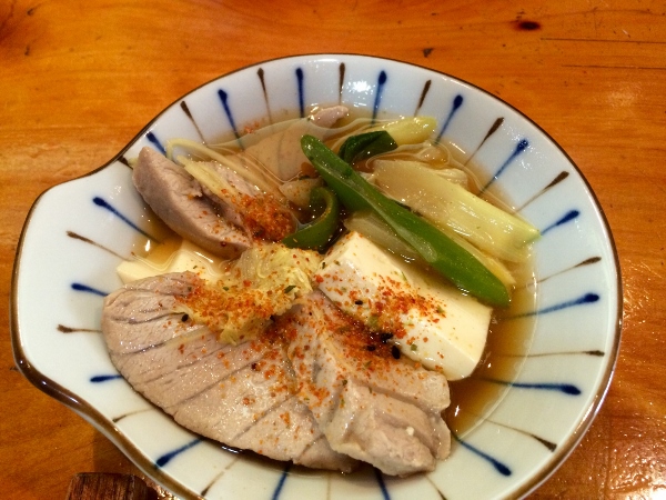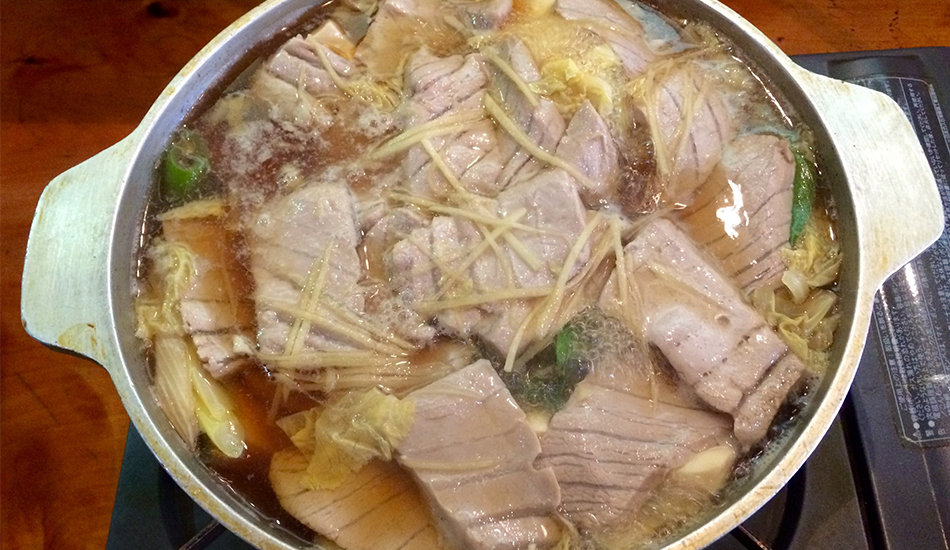 “Later on people began eating tuna but only the reddest part, the “akami”. The rest was thrown away or used for other purposes like fertilizer. Don’t forget, there was no refrigeration then, no way to keep the fish fresh. In the fishing port of Chikura in the south of Chiba prefecture, they began to cook the leftover tuna and it developed into this hot pot, spread to Edo and to Fukagawa where it became a signature dish,” adds Mr. Oyama. It’s a wonderful concoction, slices of fatty tuna, long onions and tofu in a light soy sauce broth with a touch of grated ginger. A dash of mixed peppers and it’s perfect. “The fat from the tuna creates a rich flavour so the initial broth is mild. You can leave the pot to simmer and the fish will remain soft and juicy. It won’t become hard, again because of all the fat.”