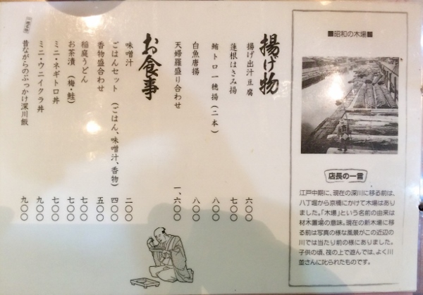 The stylish menu features photographs of old Kiba from the days when it was a floating lumberyard, together with Mr. Oyama’s reminiscences of his youth.