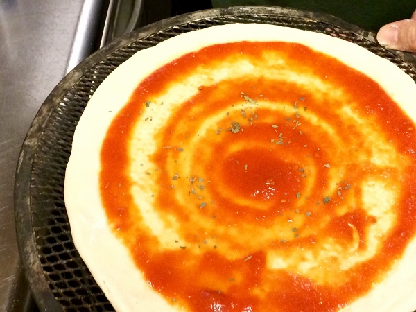The wondrous smell of baking pizza fills the air and in no time at all the base is ready.
