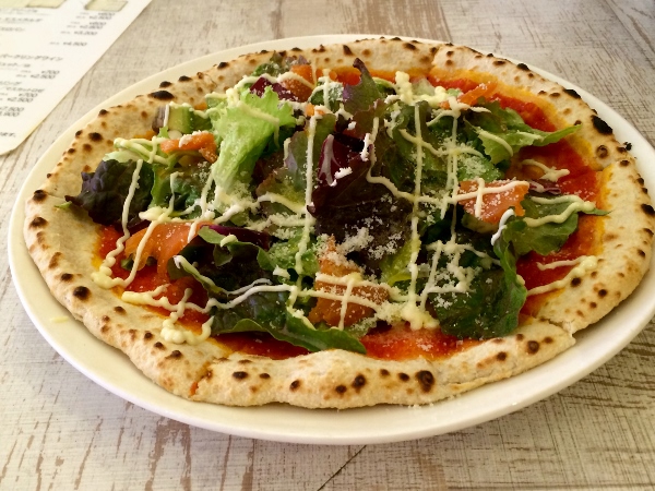 Mr. Okayama adds some salmon, vegetables, cheese, mayonnaise, and it’s done. From start to finish in the blink of an eye, a pizza insalata: doesn’t that look great!